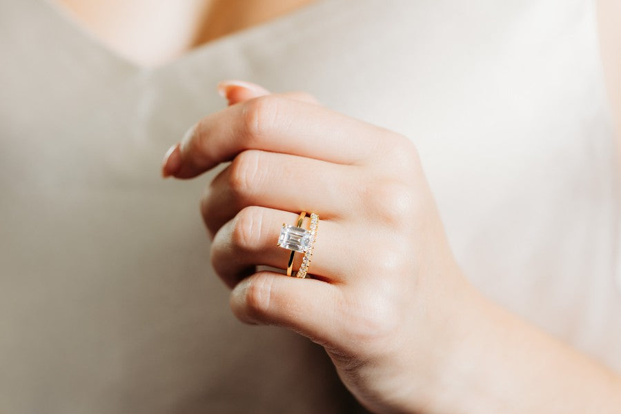 Traditionally, wedding bands are worn below engagement rings as a symbol of marital commitment. However, the positioning of your rings is a personal selection. Some individuals prefer to wear the wedding ring on top to highlight the engagement ring. While others choose to wear it below for a traditional look. The choice is entirely up to you and your personal liking.