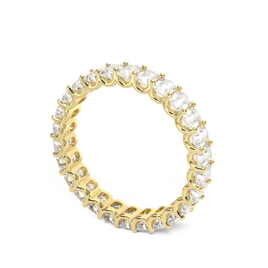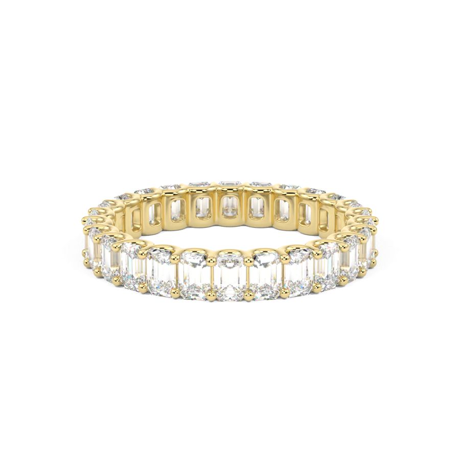 Designed to add depth, dimension, and timeless elegance to your hand. This stunning wedding ring features a continuous band of beautiful emerald-cut diamonds. Celebrated for their clean lines and sophisticated step-cut facets, they create an incredible ""hall of mirrors"" effect. It’s a captivating look that is both understated and luxurious. Stunning on its own, it also pairs beautifully with a wide range of engagement ring styles, adding a touch of architectural grace.