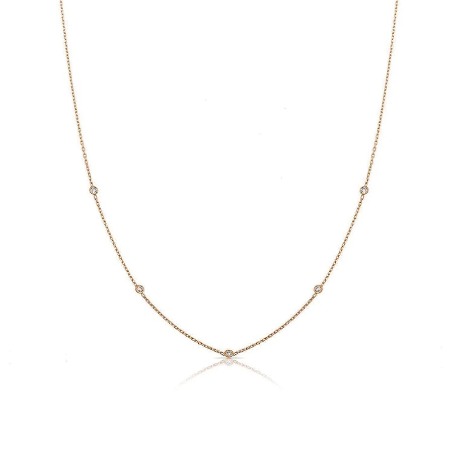 A classic made to dress up your every day. This delicate necklace features five brilliant-cut diamonds dotted along a fine gold chain, creating a look of understated luxury. The bezel settings protect each stone and provide a clean, modern finish. It’s a piece that looks stunning on its own for a subtle touch of sparkle, but it truly shines when layered with your other favourite necklaces. This is the definition of a modern, versatile diamond staple.