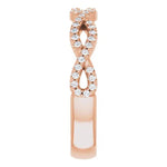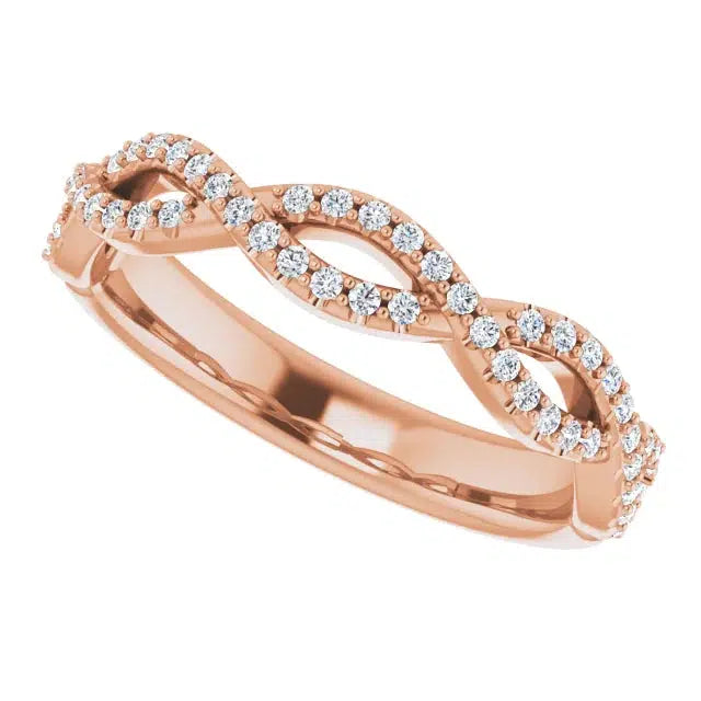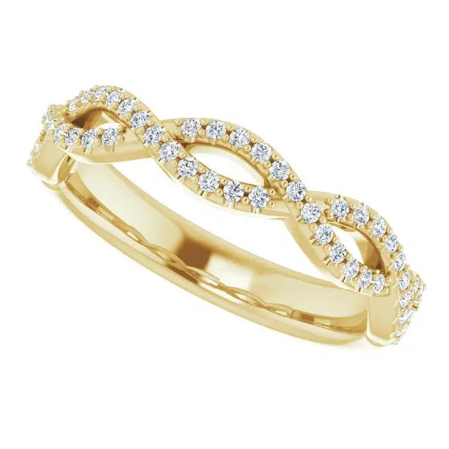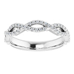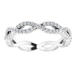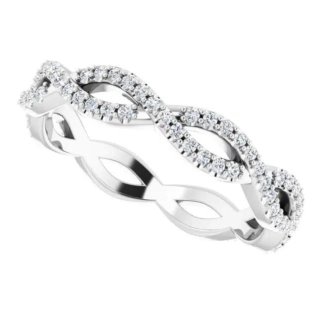 A beautiful, modern symbol of infinite connection. Our ""Infinity"" eternity ring features a stunning design of interwoven diamonds that creates a continuous, sparkling embrace around the finger. It’s a captivating and romantic style that pairs beautifully with many engagement rings, and we can even custom-fit it to sit perfectly with your own. This is a must-try-on piece for those who want their forever ring to tell a story of unending love.