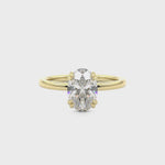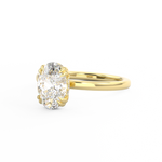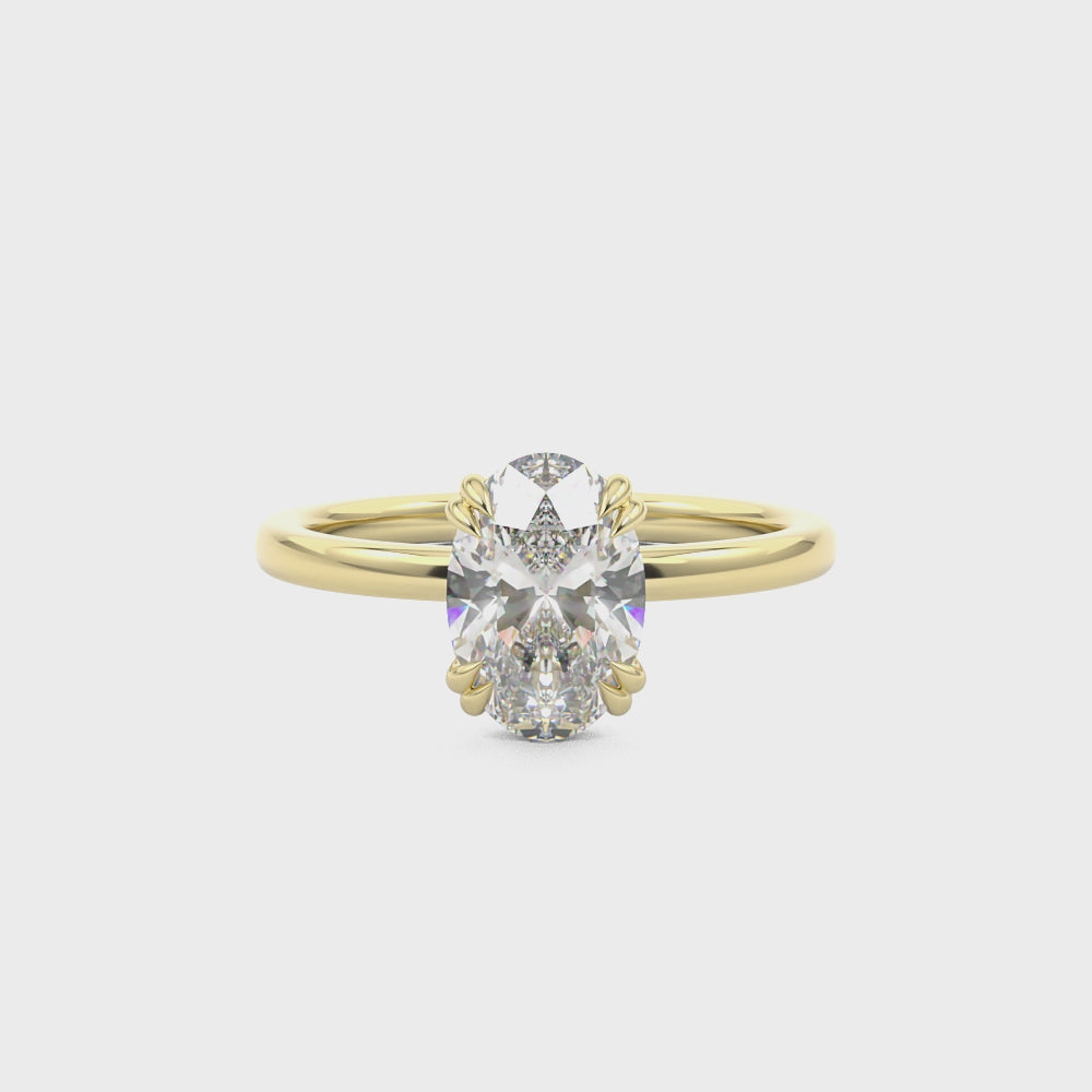 A classic design with a refined, contemporary detail. This engagement ring takes the timeless beauty of the oval solitaire and adds a sophisticated touch. The brilliant, finger-flattering oval diamond is held securely by distinctive double claw prongs. This detail not only provides extra security but also beautifully enhances the stone's shape for a unique, elegant look. For a touch of extra sparkle, we can also craft this design with a hidden halo.