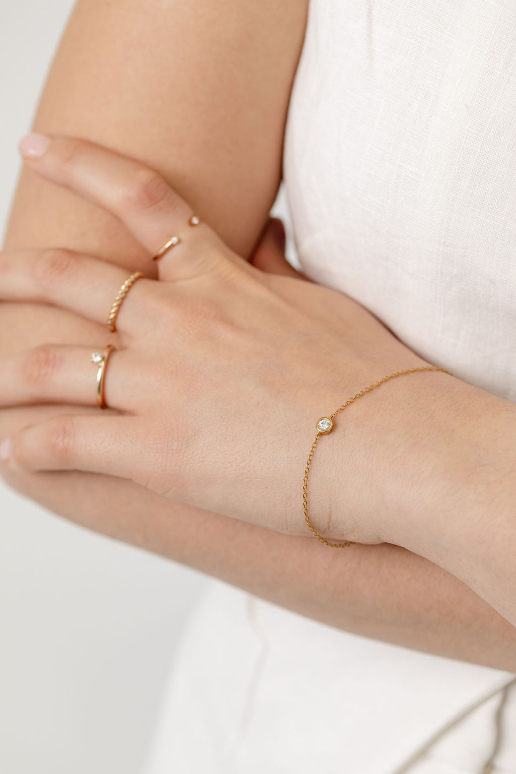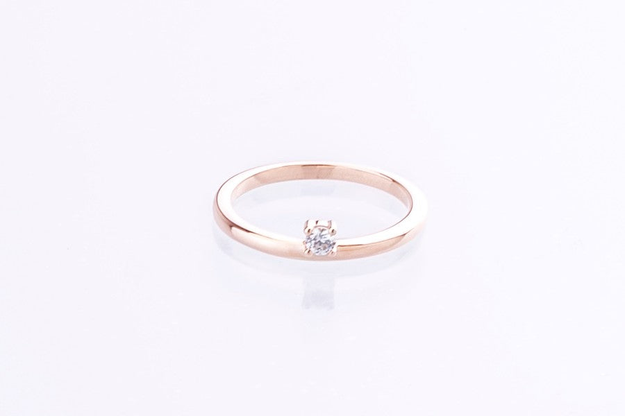 Solid gold ring with a floating diamond or moissanite - a beautiful play on a classic. Understated with a flash of white glistening sparkle, show it off!