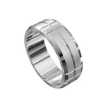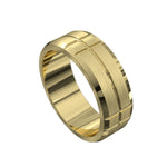 Hali Brushed mens wedding band featuring polished beveled edges and handcarved grooves