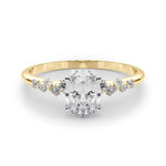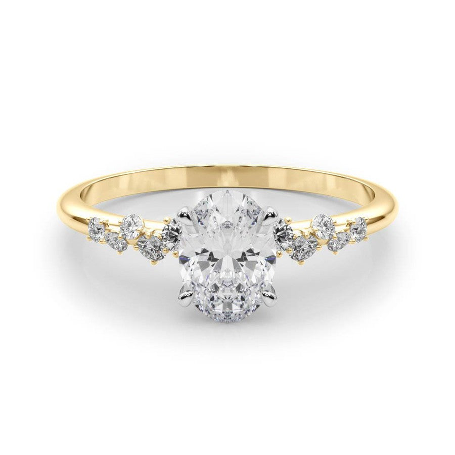Our oval moissanite scatter ring features a beautiful oval centre stone with scattered moissanite on the band.