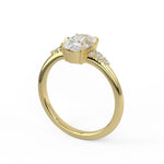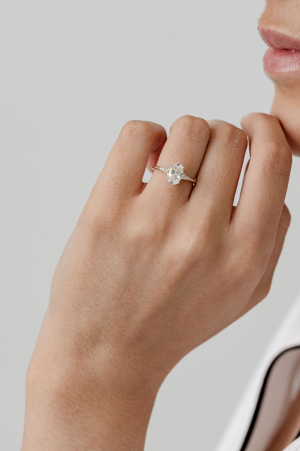 A brilliant twist on a timeless classic. Our ""Krystal"" ring boasts a stunning oval centre stone, held above a band of beautiful, sparkling diamonds. In a unique and thoughtful design, the diamonds along the band vary in size, creating a subtle taper that elegantly draws your eye into the main stone. It’s a captivating design that provides incredible sparkle from every angle while ensuring the stunning oval diamond remains the true star of the show.