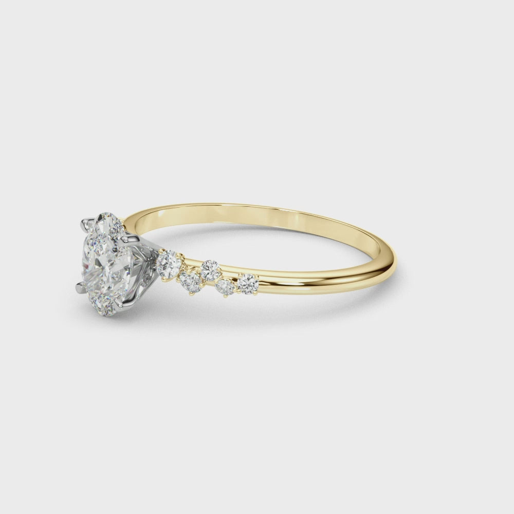 For the person who finds beauty in perfect imperfection. Our oval diamond scatter ring is a truly unique and artistic design. It features a beautiful oval centre stone, with smaller brilliant diamonds playfully scattered across the band in an organic, asymmetrical pattern. Each ring is made to order, ensuring your final piece has a one-of-a-kind feel that reflects your individual style. It’s a stunning and joyful alternative to a traditional solitaire.