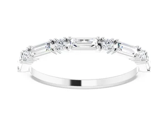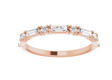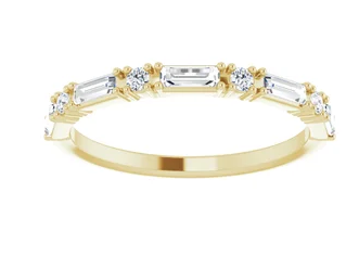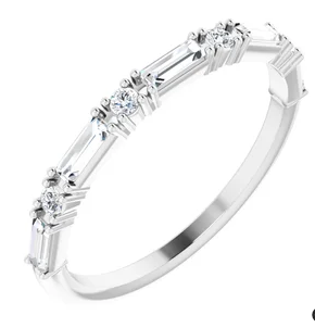 The perfect blend of glitter and sparkle. The ""Eleanor"" ring is a masterclass in contrast, alternating the fiery brilliance of round diamonds with the clean, flashing light of baguette cuts. This beautiful combination creates a unique and captivating sparkle. It’s an especially stunning choice to pair with step-cut engagement rings (like Emerald or Asscher cuts) as it echoes their clean lines while adding a touch of classic brilliance.