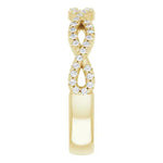 A beautiful, modern symbol of infinite connection. Our ""Infinity"" eternity ring features a stunning design of interwoven diamonds that creates a continuous, sparkling embrace around the finger. It’s a captivating and romantic style that pairs beautifully with many engagement rings, and we can even custom-fit it to sit perfectly with your own. This is a must-try-on piece for those who want their forever ring to tell a story of unending love.