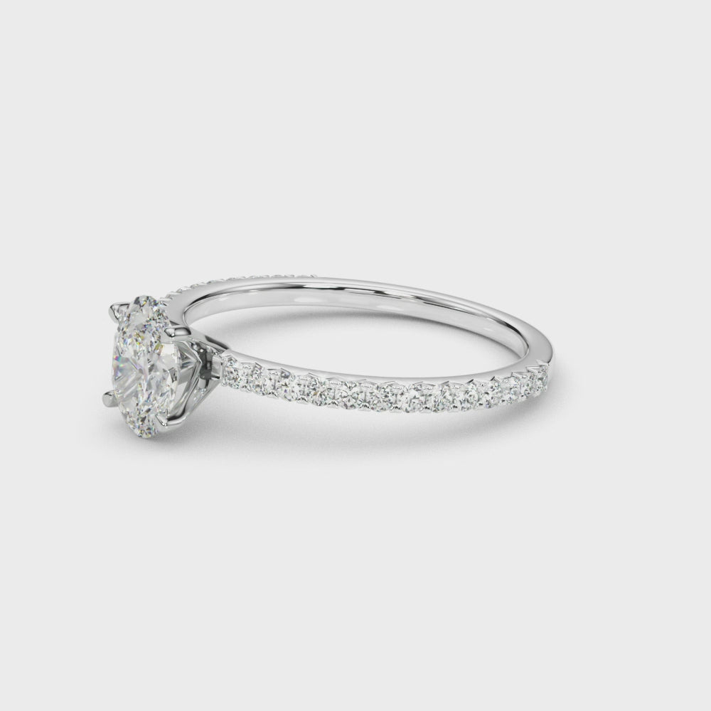 The beginning of a legacy. This is a truly classic beauty, designed to be a timeless symbol of your commitment. Our ""Legacy"" ring features a stunning oval shape diamond, celebrated for its brilliant sparkle and flattering shape, set upon a fine, glittering diamond band. The result is an engagement ring with breathtaking fire from every single angle. Our bespoke process ensures we find the perfect centre stone for you, creating a modern heirloom that is yours alone.
