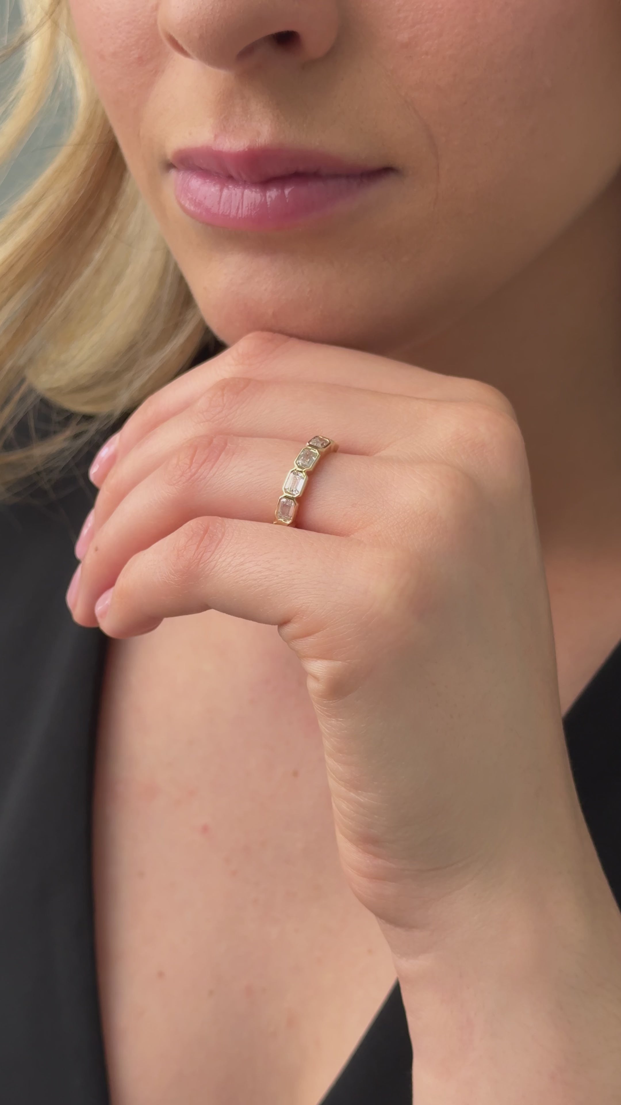 A captivating and confident statement piece. The ""Rhiannon"" is a stunning ring for those who love modern, architectural design. It features a row of beautiful emerald-cut diamonds, each one held securely in a sleek and smooth bezel setting. This not only protects the stones but also creates a clean, powerful look that is both refined and incredibly stylish. It’s a fabulous statement piece worn on its own and also pairs beautifully with many of our engagement ring designs.